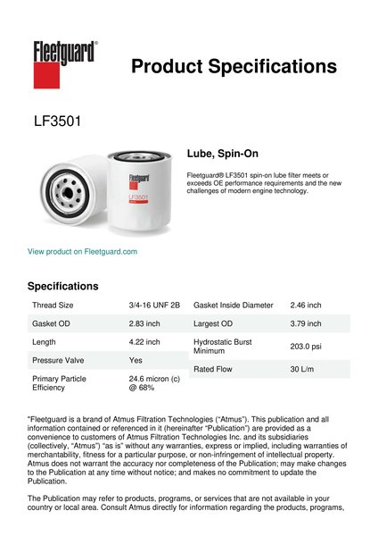 Fleetguard® LF3501 spin-on lube filter meets or exceeds OE performance requirements and the new challenges of modern engine technology.Specification