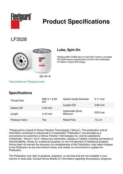 Fleetguard® LF3528 spin-on lube filter meets or exceeds OE performance requirements and the new challenges of modern engine technology.Specification