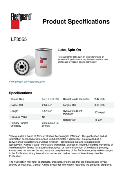 Fleetguard® LF3555 spin-on lube filter meets or exceeds OE performance requirements and the new challenges of modern engine technology.Specification
