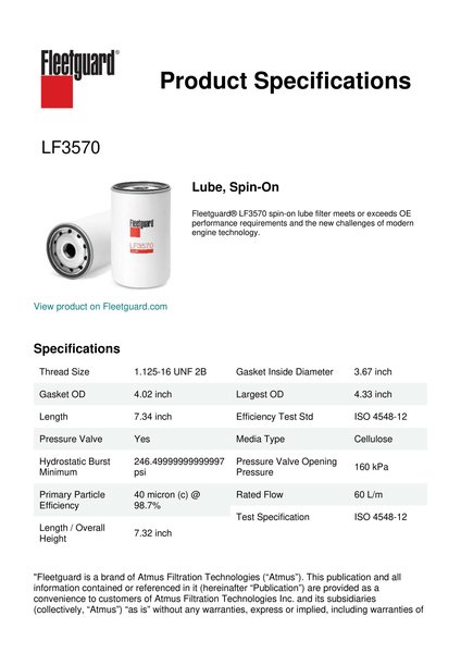Fleetguard® LF3570 spin-on lube filter meets or exceeds OE performance requirements and the new challenges of modern engine technology.Specification