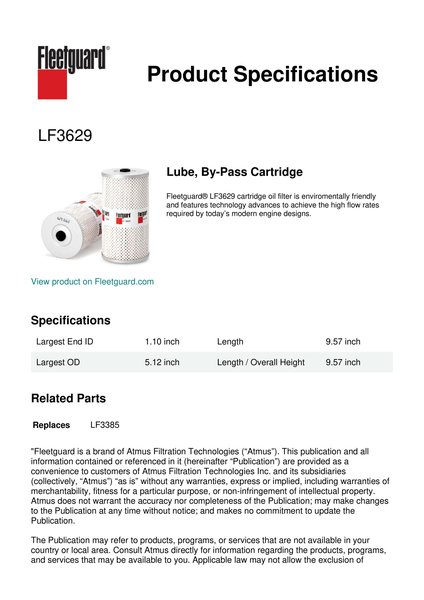 Fleetguard® LF3629 cartridge oil filter is enviromentally friendly and features technology advances to achieve the high flow rates required by today’s modern engine designs.Specification