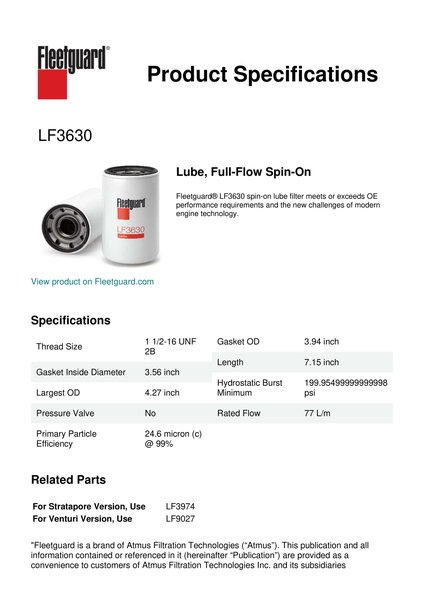 Fleetguard® LF3630 spin-on lube filter meets or exceeds OE performance requirements and the new challenges of modern engine technology.Specification