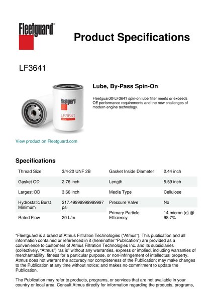 Fleetguard® LF3641 spin-on lube filter meets or exceeds OE performance requirements and the new challenges of modern engine technology.Specification