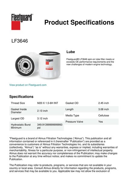 Fleetguard® LF3646 spin-on lube filter meets or exceeds OE performance requirements and the new challenges of modern engine technology.Specification