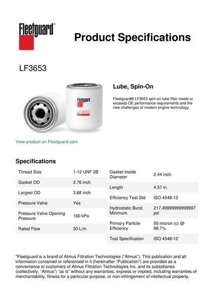 Fleetguard® LF3653 spin-on lube filter meets or exceeds OE performance requirements and the new challenges of modern engine technology.Specification