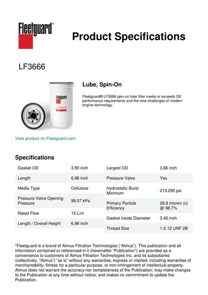 Fleetguard® LF3666 spin-on lube filter meets or exceeds OE performance requirements and the new challenges of modern engine technology.Specification