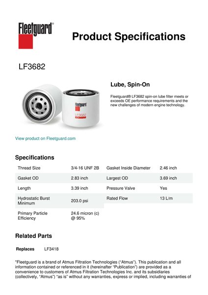 Fleetguard® LF3682 spin-on lube filter meets or exceeds OE performance requirements and the new challenges of modern engine technology.Specification