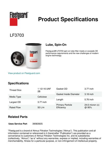 Fleetguard® LF3703 spin-on lube filter meets or exceeds OE performance requirements and the new challenges of modern engine technology.Specification