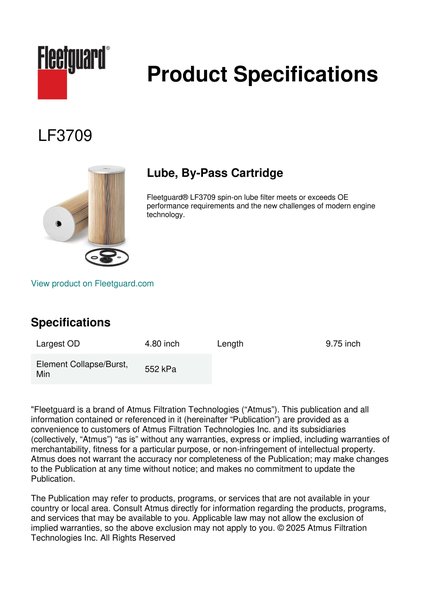 Fleetguard® LF3709 spin-on lube filter meets or exceeds OE performance requirements and the new challenges of modern engine technology.Specification