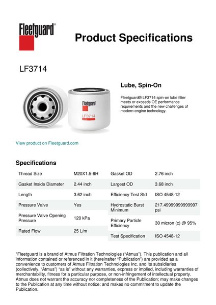 Fleetguard® LF3714 spin-on lube filter meets or exceeds OE performance requirements and the new challenges of modern engine technology.Specification