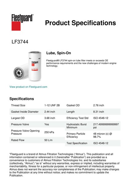 Fleetguard® LF3744 spin-on lube filter meets or exceeds OE performance requirements and the new challenges of modern engine technology.Specification