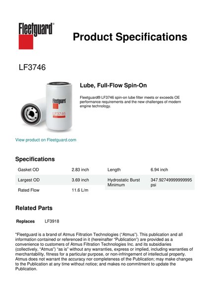 Fleetguard® LF3746 spin-on lube filter meets or exceeds OE performance requirements and the new challenges of modern engine technology.Specification