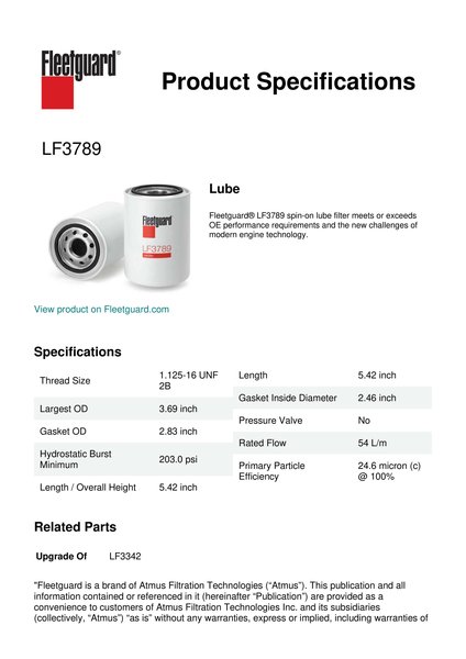 Fleetguard® LF3789 spin-on lube filter meets or exceeds OE performance requirements and the new challenges of modern engine technology.Specification