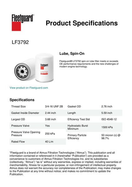 Fleetguard® LF3792 spin-on lube filter meets or exceeds OE performance requirements and the new challenges of modern engine technology.Specification