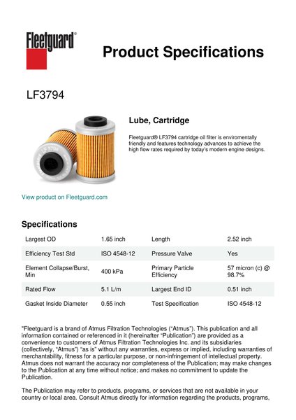 Fleetguard® LF3794 cartridge oil filter is enviromentally friendly and features technology advances to achieve the high flow rates required by today’s modern engine designs.Specification