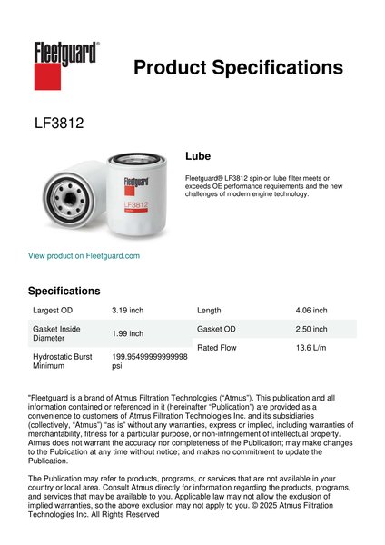 Fleetguard® LF3812 spin-on lube filter meets or exceeds OE performance requirements and the new challenges of modern engine technology.Specification