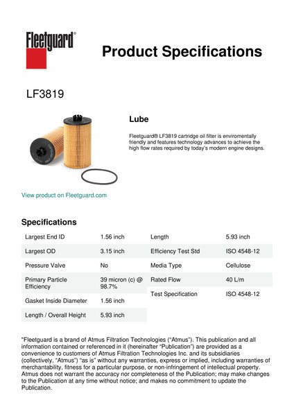 Fleetguard® LF3819 cartridge oil filter is enviromentally friendly and features technology advances to achieve the high flow rates required by today’s modern engine designs.Specification