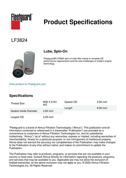 Fleetguard® LF3824 spin-on lube filter meets or exceeds OE performance requirements and the new challenges of modern engine technology.Specification