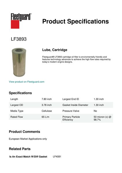 Fleetguard® LF3893 cartridge oil filter is enviromentally friendly and features technology advances to achieve the high flow rates required by today’s modern engine designs.Specification