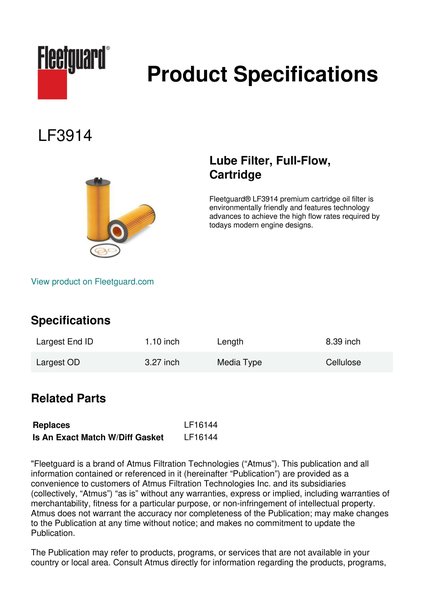 Fleetguard® LF3914 premium hydraulic cartridge filter with wire mesh media is designed to help keep your precision hydraulic systems running as intended, providing a solution for various applications. This filter meets or exceeds the equipment OEM quality and performance and is the first aftermarket replacement available on the market today, bringing your operation top-quality performance and an overall unbeatable total cost of ownership.Specification