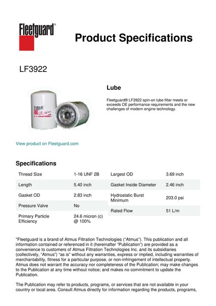 Fleetguard® LF3922 spin-on lube filter meets or exceeds OE performance requirements and the new challenges of modern engine technology.Specification
