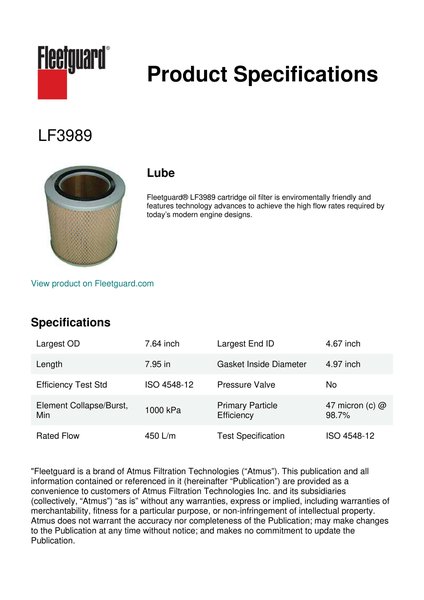 Fleetguard® LF3989 cartridge oil filter is enviromentally friendly and features technology advances to achieve the high flow rates required by today’s modern engine designs.Specification