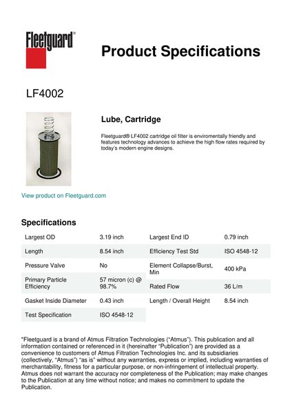 Fleetguard® LF4002 cartridge oil filter is enviromentally friendly and features technology advances to achieve the high flow rates required by today’s modern engine designs.Specification