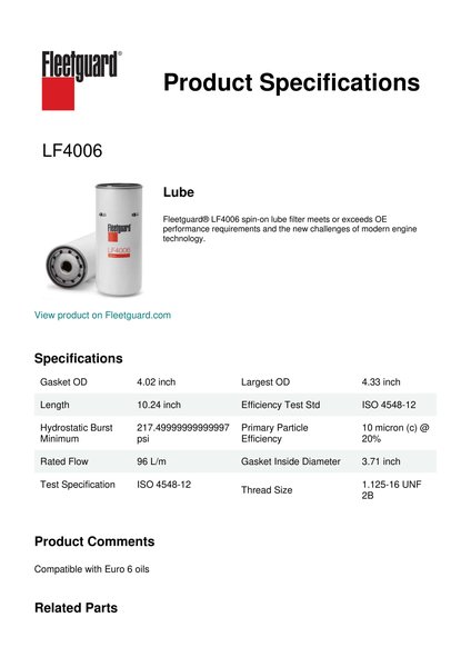 Fleetguard® LF4006 spin-on lube filter meets or exceeds OE performance requirements and the new challenges of modern engine technology.Specification