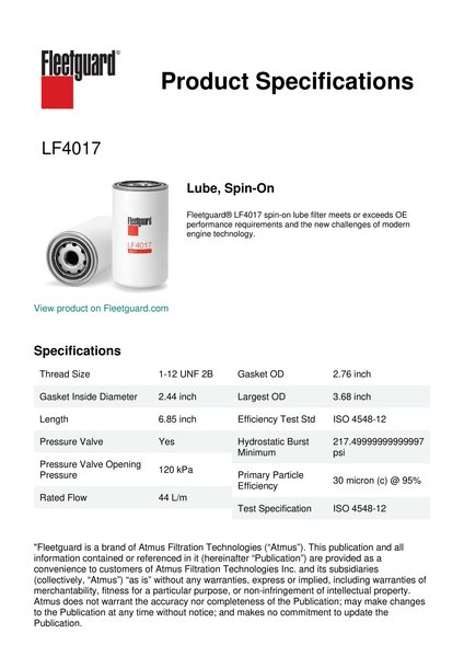 Fleetguard® LF4017 spin-on lube filter meets or exceeds OE performance requirements and the new challenges of modern engine technology.Specification