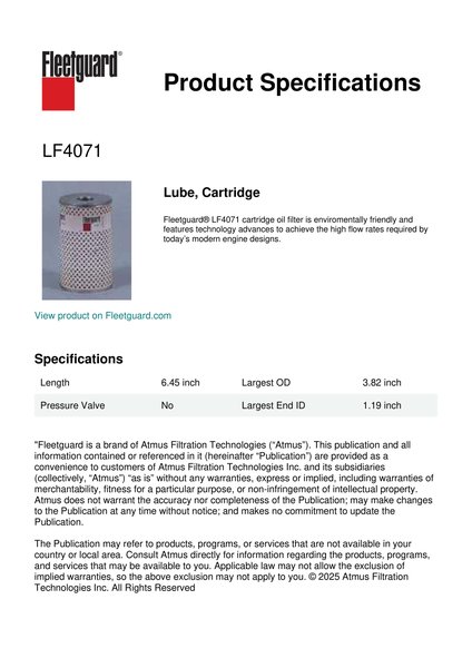 Fleetguard® LF4071 cartridge oil filter is enviromentally friendly and features technology advances to achieve the high flow rates required by today’s modern engine designs.Specification