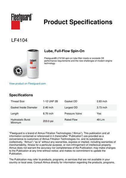 Fleetguard® LF4104 spin-on lube filter meets or exceeds OE performance requirements and the new challenges of modern engine technology.Specification