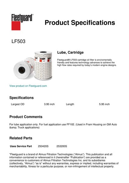 Fleetguard® LF503 cartridge oil filter is enviromentally friendly and features technology advances to achieve the high flow rates required by today’s modern engine designs.Specification