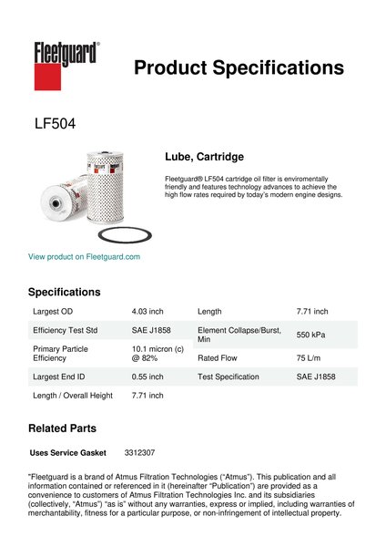Fleetguard® LF504 cartridge oil filter is enviromentally friendly and features technology advances to achieve the high flow rates required by today’s modern engine designs.Specification