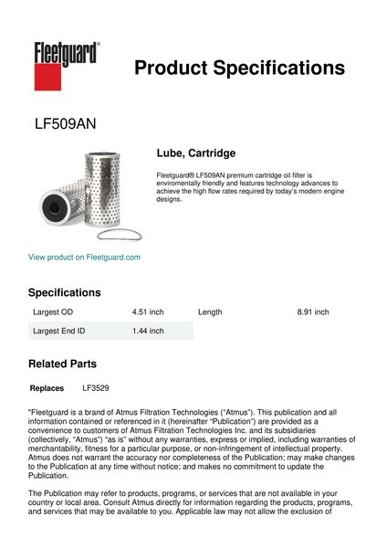 Fleetguard® LF509AN premium cartridge oil filter is enviromentally friendly and features technology advances to achieve the high flow rates required by today’s modern engine designs.Specification