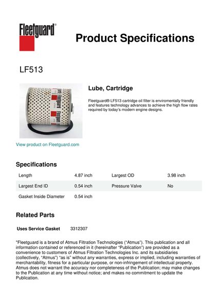 Fleetguard® LF513 cartridge oil filter is enviromentally friendly and features technology advances to achieve the high flow rates required by today’s modern engine designs.Specification