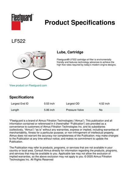 Fleetguard® LF522 cartridge oil filter is enviromentally friendly and features technology advances to achieve the high flow rates required by today’s modern engine designs.Specification