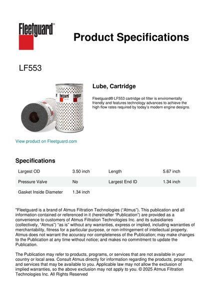 Fleetguard® LF553 cartridge oil filter is enviromentally friendly and features technology advances to achieve the high flow rates required by today’s modern engine designs.Specification