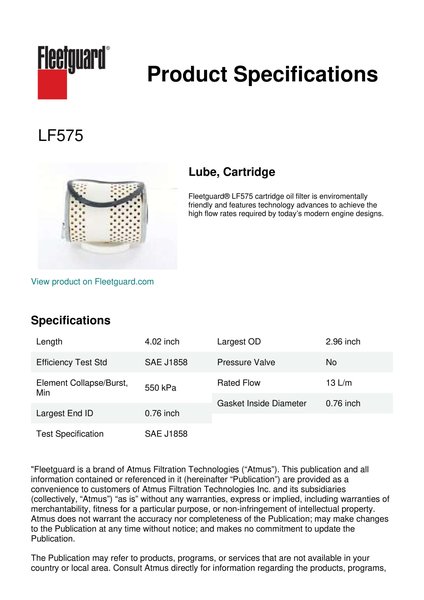 Fleetguard® LF575 cartridge oil filter is enviromentally friendly and features technology advances to achieve the high flow rates required by today’s modern engine designs.Specification