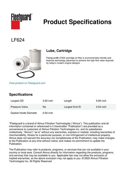 Fleetguard® LF624 cartridge oil filter is enviromentally friendly and features technology advances to achieve the high flow rates required by today’s modern engine designs.