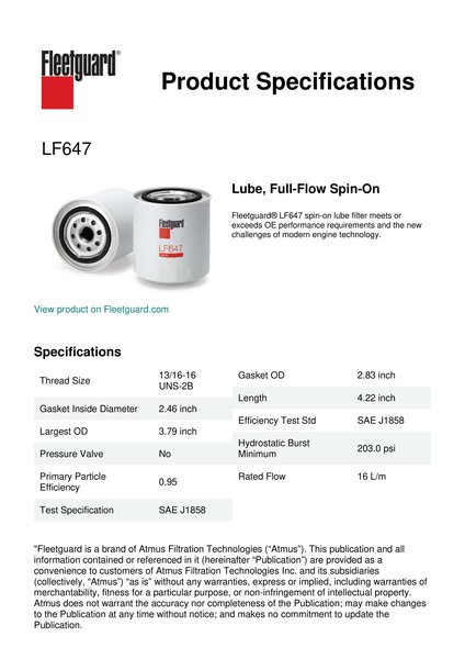 Fleetguard® LF647 spin-on lube filter meets or exceeds OE performance requirements and the new challenges of modern engine technology.Specification