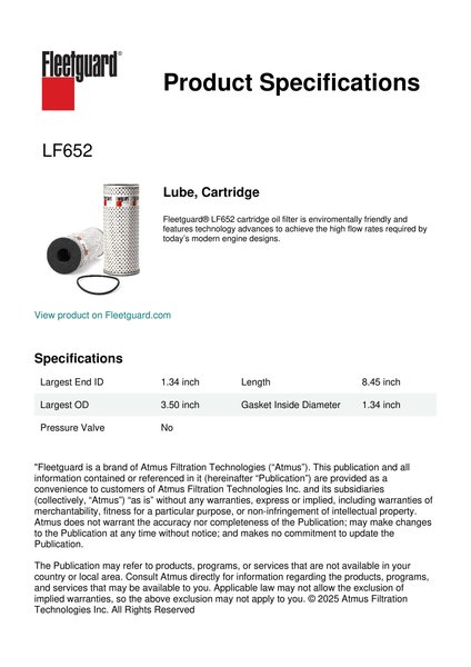 Fleetguard® LF652 cartridge oil filter is enviromentally friendly and features technology advances to achieve the high flow rates required by today’s modern engine designs.Specification