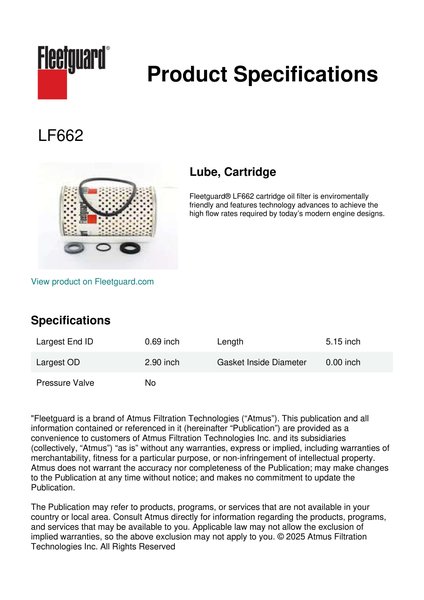 Fleetguard® LF662 cartridge oil filter is enviromentally friendly and features technology advances to achieve the high flow rates required by today’s modern engine designs.Specification