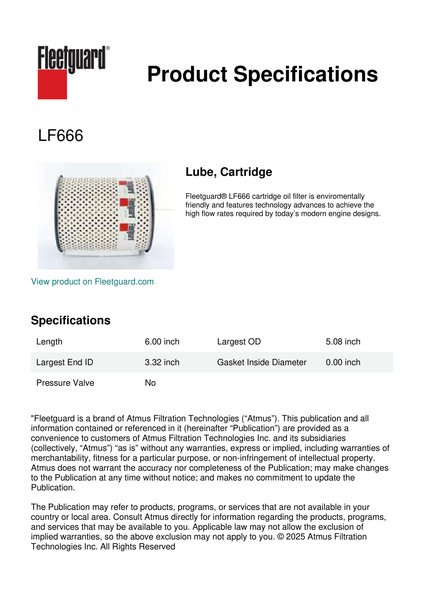 Fleetguard® LF666 cartridge oil filter is enviromentally friendly and features technology advances to achieve the high flow rates required by today’s modern engine designs.Specification
