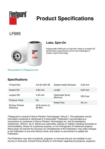 Fleetguard® LF695 spin-on lube filter meets or exceeds OE performance requirements and the new challenges of modern engine technology.Specification
