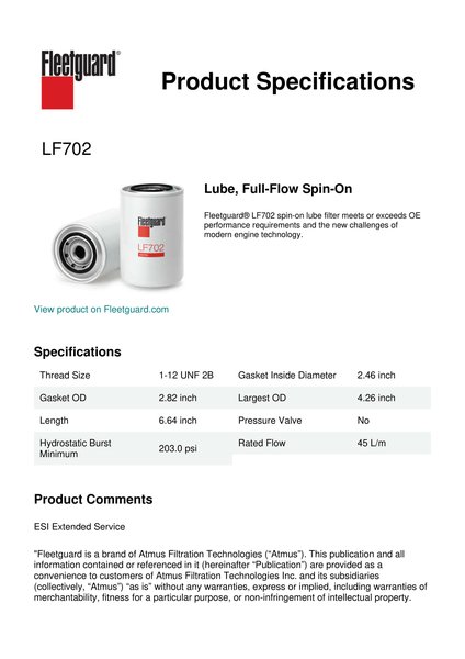 Fleetguard® LF702 spin-on lube filter meets or exceeds OE performance requirements and the new challenges of modern engine technology.Specification