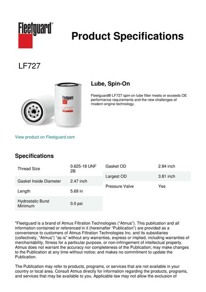 Fleetguard® LF727 spin-on lube filter meets or exceeds OE performance requirements and the new challenges of modern engine technology.Specification
