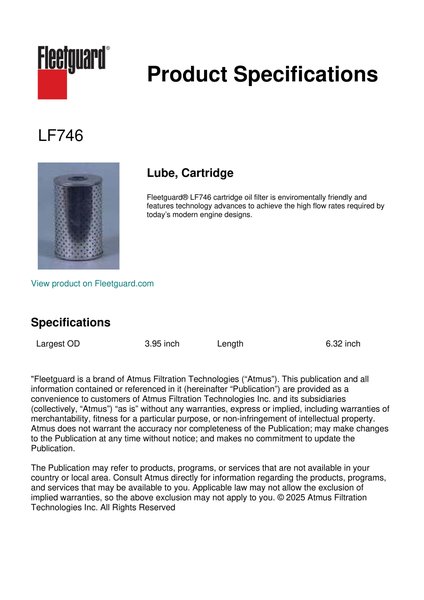 Fleetguard® LF746 cartridge oil filter is enviromentally friendly and features technology advances to achieve the high flow rates required by today’s modern engine designs.Specification