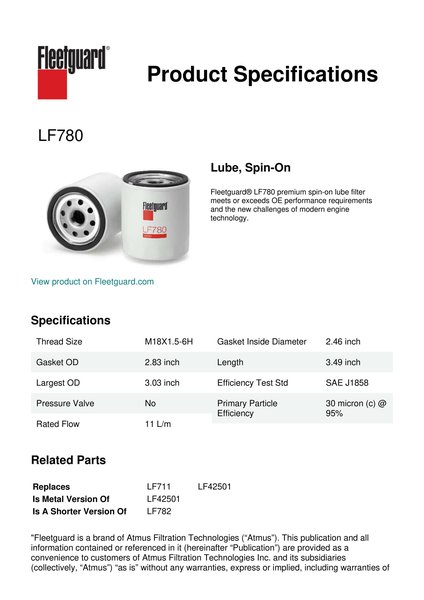 Fleetguard® LF780 premium spin-on lube filter meets or exceeds OE performance requirements and the new challenges of modern engine technology.Specification