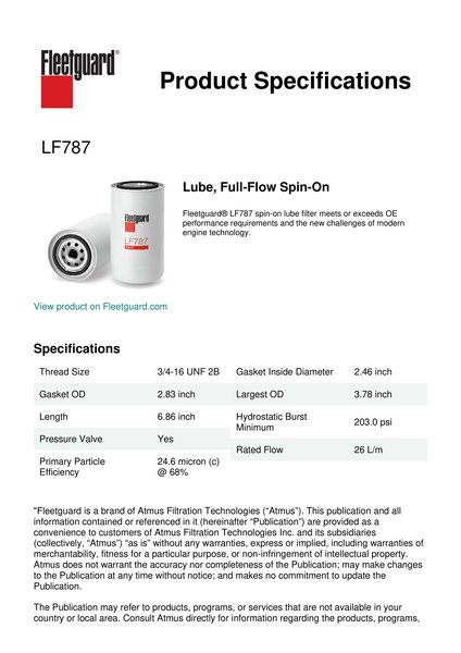 Fleetguard® LF787 spin-on lube filter meets or exceeds OE performance requirements and the new challenges of modern engine technology.Specification