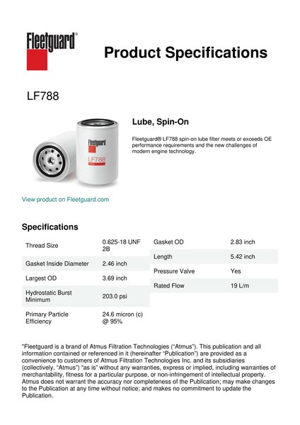 Fleetguard® LF788 spin-on lube filter meets or exceeds OE performance requirements and the new challenges of modern engine technology.Specification